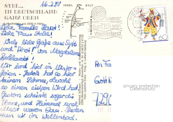 72692895 alte Postkarte Insel Sylt Luftaufnahme aus 3000 m Hoehe postalisch gelaufen Erhaltung siehe scans [FriedD77] KatCode: 11110001054151