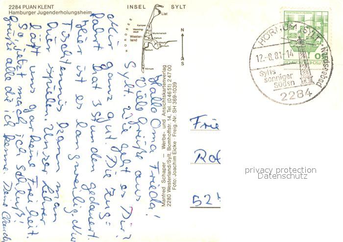 73734520 alte Postkarte Insel Sylt Puan Klent Hamburger Jugenderholungsheim postalisch gelaufen Fliegeraufnahme Erhaltung siehe scans [FriedD77] KatCode: 11110001054151