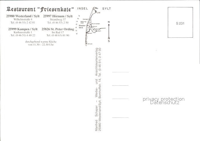 72375249 Insel Sylt Restaurant Friesenkate in Westerland Hoernum Kampen St Peter Ording postalisch nicht gelaufen Erhaltung siehe scans KatCode: 11110001054151