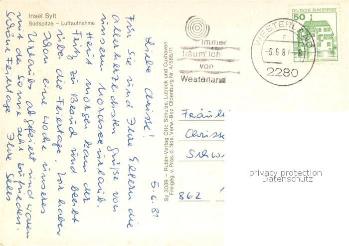 73722079 alte Postkarte Insel Sylt Suedspitze Fliegeraufnahme postalisch gelaufen Erhaltung siehe scans [WerneD78] KatCode: 11110001054151