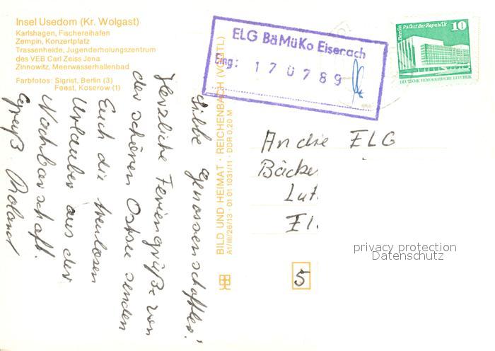 73061272 alte Postkarte Insel Usedom Karlshagen Fischereihafen Zempin Konzertplatz Trassenheide Erholungszentrum Zinnowitz Meerwasserhallenbad postalisch gelaufen Erhaltung siehe scans [FriedD77] KatCode: 11110013059097