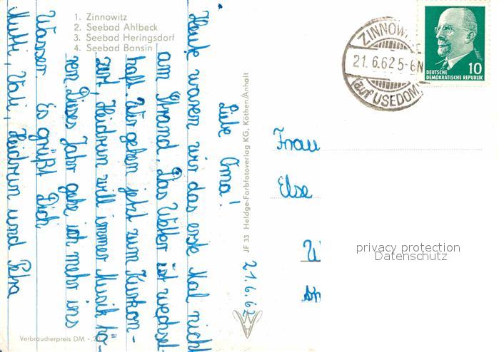 72651972 alte Postkarte Insel Usedom Zinnowitz Seebaeder Ahlbeck Heringsdorf Bansin postalisch gelaufen Erhaltung siehe scans [WerneD78] KatCode: 11110013059097