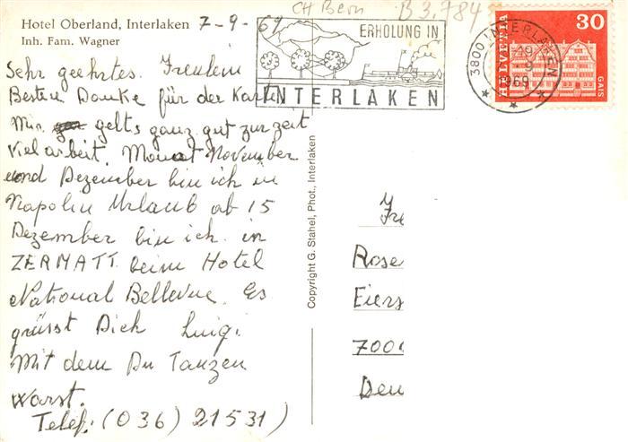 13868990 alte Postkarte Interlaken BE Hotel Oberland postalisch gelaufen Erhaltung siehe scans [FriedD77] KatCode: 11470060175264