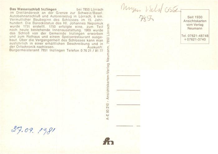 73948424 Inzlingen Wasserschloss postalisch nicht gelaufen Erhaltung siehe scans [WerneD78] KatCode: 11110008336043