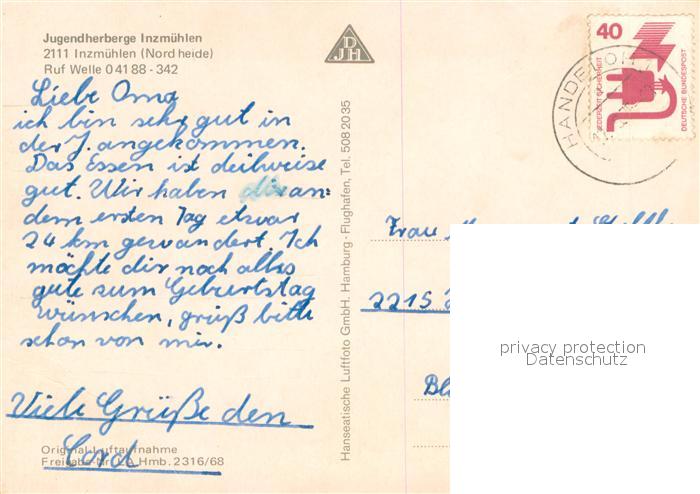 73726814 alte Postkarte Inzmuehlen Jugendherberge in der Nordheide postalisch gelaufen Fliegeraufnahme Erhaltung siehe scans [FriedD77] KatCode: 11110003353015