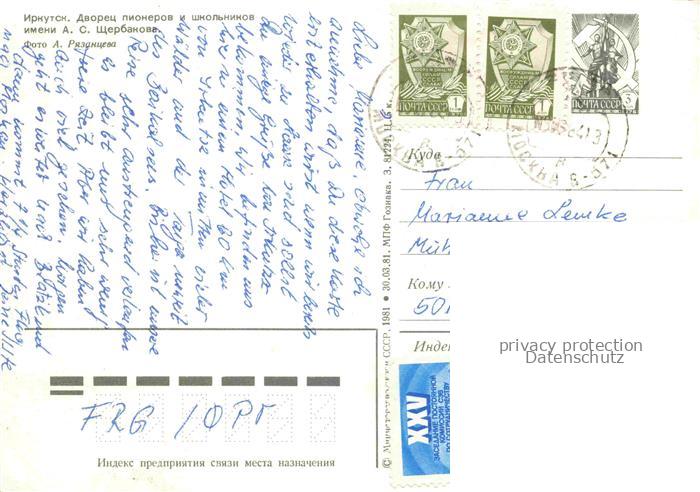 74042133 old postcard Irkutsk Irkoutsk RU Schloss Pionieren Schuler A.S. Stscherbakova postalisch gelaufen Erhaltung siehe scans [IrynaD87] KatCode: 11440