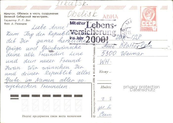 old postcard Irkutsk Obelisk postalisch gelaufen Erhaltung siehe scans