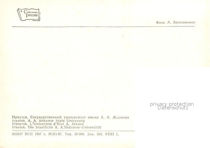 13638641 Irkutsk Staatliche Shdanow Universitaet postalisch nicht gelaufen Erhaltung siehe scans [FriedD77] Frie Katcode 11440