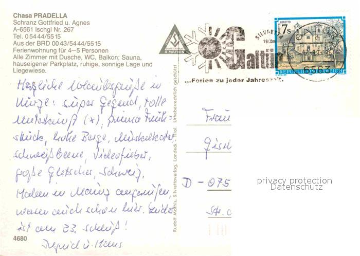 72627559 alte Postkarte Ischgl Chasa Pradella Ferienwohnungen postalisch gelaufen Erhaltung siehe scans [FriedD77] KatCode: 11390334070608