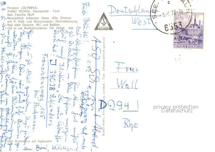 73588124 alte Postkarte Ischgl Pension Olympia Fremdenzimmer Paznauntal Freibad Bergbahn Alpen postalisch gelaufen Erhaltung siehe scans [FriedD77] KatCode: 11390334070608