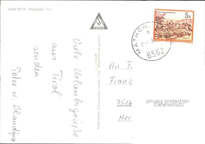 72438080 alte Postkarte Ischgl teilansicht postalisch gelaufen Erhaltung siehe scans KatCode: 11390334070608