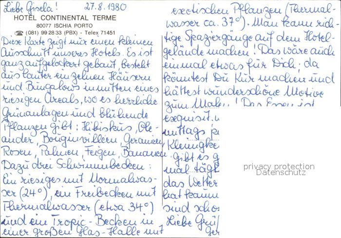 Ischia Hotel Continental Terme postalisch nicht gelaufen Erhaltung siehe scans