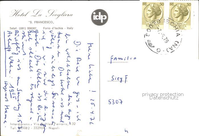 old postcard Ischia Hotel la Scogliera postalisch gelaufen Erhaltung siehe scans