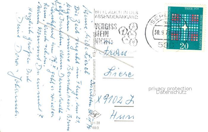 73292591 alte Postkarte Iserlohn Blick vom Danzturm Gruenetal Wermingserstrasse Kath Kirche Rathausplatz Seilsersee Rupenteich An der Schlacht postalisch gelaufen Erhaltung siehe scans [WerneD78] KatCode: 11110005962024