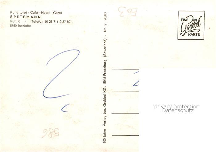 73836234 Iserlohn Konditorei Cafe Hotel garni Spetsmann postalisch nicht gelaufen Erhaltung siehe scans [WerneD78] KatCode: 11110005962024