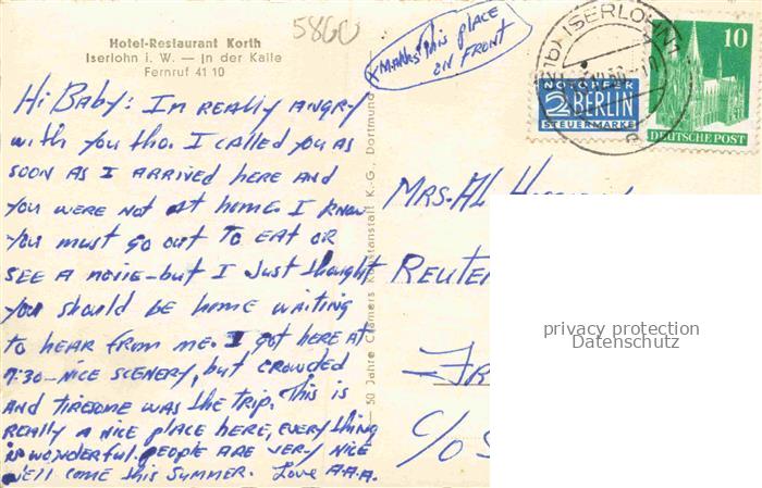 74100186 alte Postkarte ISERLOHN NRW Hotel Restaurant Korth Fliegeraufnahme postalisch gelaufen Erhaltung siehe scans [WerneD78] KatCode: 11110005962024