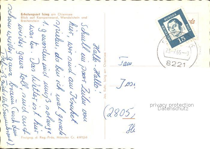 72071195 alte Postkarte Ising Chiemsee mit Kampenwand Wendelstein und Breitenstein postalisch gelaufen Erhaltung siehe scans KatCode: 11110009189114