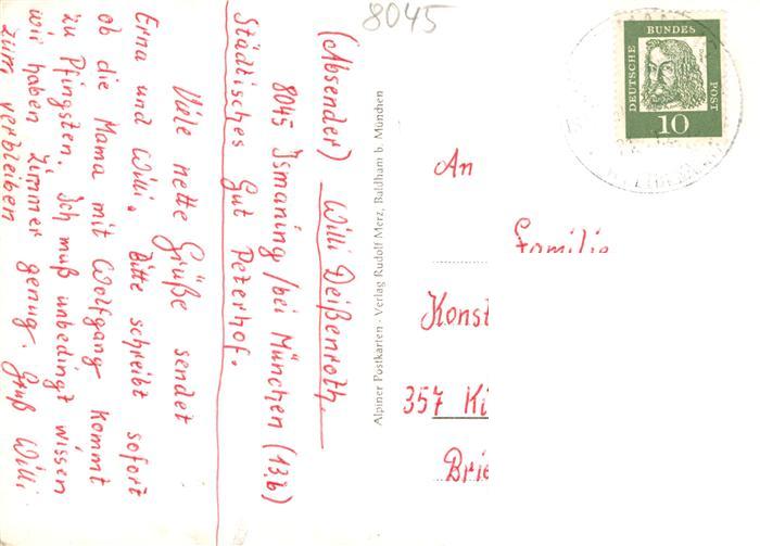73872098 alte Postkarte Ismaning Panorama Madonna Kath Pfarrkirche St Johann Paptist Weiher Schloss mit Kriegerdenkmal Isarbruecke Knabenschule Maedchenschule postalisch gelaufen Erhaltung siehe scans [FriedD77] KatCode: 11110009184130