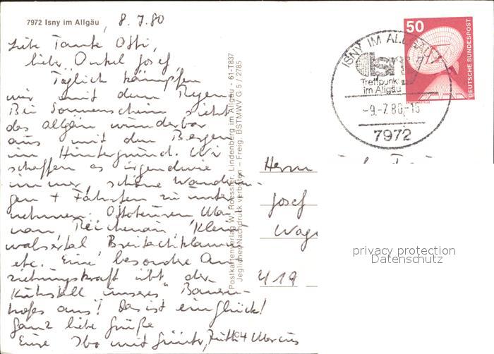 72309440 alte Postkarte Isny Allgaeu Fliegeraufnahme postalisch gelaufen Erhaltung siehe scans KatCode: 11110008436049