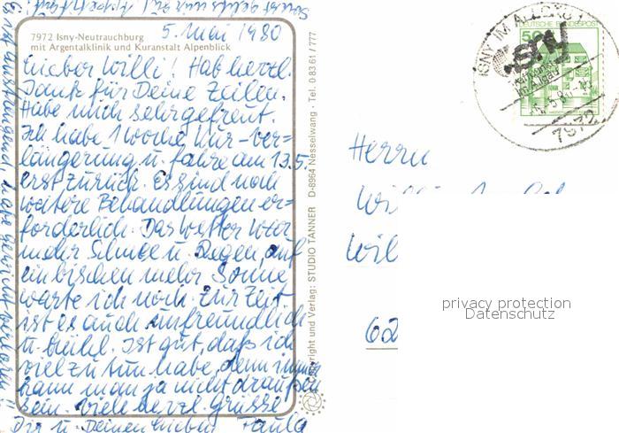 72916399 alte Postkarte Isny Allgaeu Fliegeraufnahme Neutrauchburg Argentalklinik Kuranstalt Alpenblick postalisch gelaufen Erhaltung siehe scans [LiesaD40] KatCode: 11110008436049