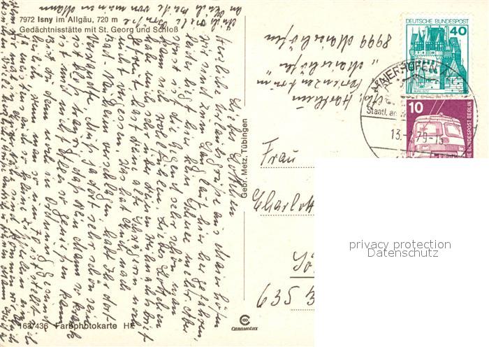73244609 alte Postkarte Isny Allgaeu Gedaechtnisstaette mit St. Georg und Schloss postalisch gelaufen Erhaltung siehe scans [LiesaD40] KatCode: 11110008436049