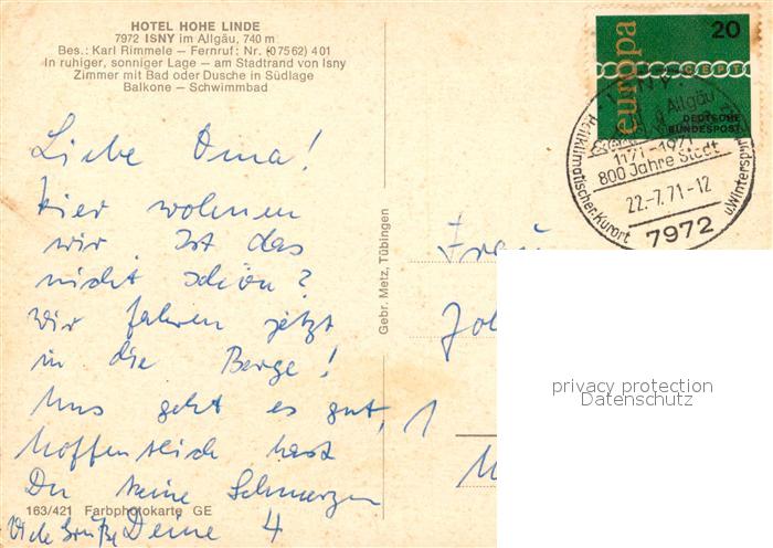 73575422 alte Postkarte Isny Allgaeu Hotel Hohe Linde Swiming Pool postalisch gelaufen Erhaltung siehe scans [FriedD77] KatCode: 11110008436049