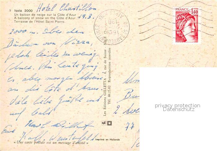 12892656 carte postale Isola Alpes-Maritimes Terrassenhotel Saint Pierre postalisch gelaufen Erhaltung siehe scans [AndreD76] KatCode: 11170006206073