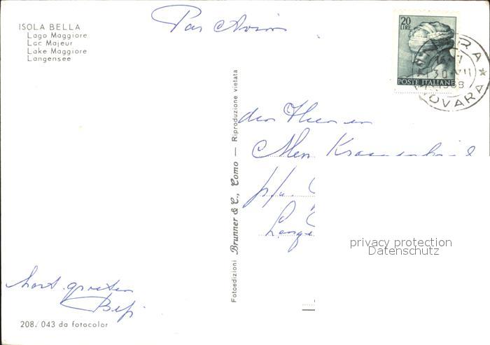 old postcard Isola Bella Lago Maggiore Ansicht vom Ufer aus Schwaene Alpen postalisch gelaufen Erhaltung siehe scans
