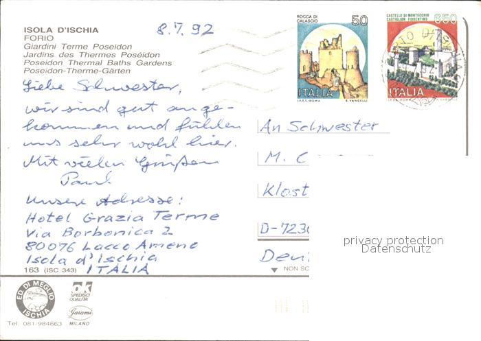 old postcard Isola d Ischia Poseidon Therme Gaerten postalisch gelaufen Erhaltung siehe scans