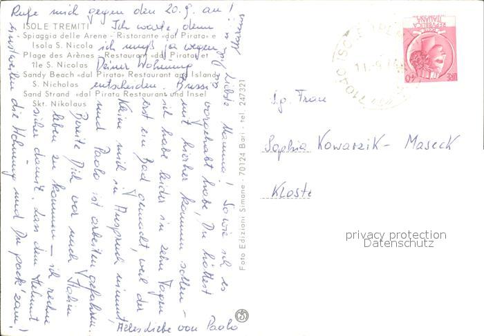 old postcard Isole Tremiti Sandstrand Pirata Restaurant Insel St Nikolaus postalisch gelaufen Erhaltung siehe scans