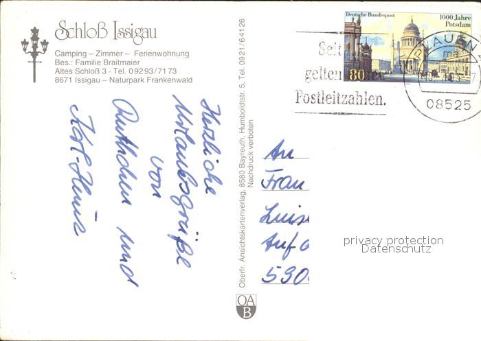 72064852 alte Postkarte Issigau Schloss Ferienwohnung Restaurant Camping Naturpark Frankenwald postalisch gelaufen Erhaltung siehe scans KatCode: 11110009475137
