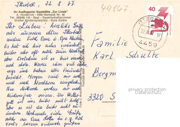 73855348 alte Postkarte Itterbeck Ausflugsziel Gaststaette zur Linde Kinderspielplatz postalisch gelaufen Erhaltung siehe scans [FriedD77] KatCode: 11110003456011