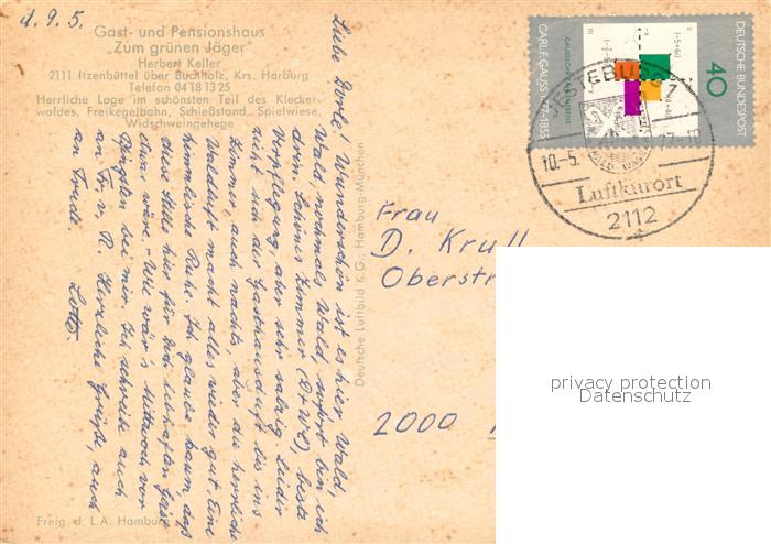 73722736 alte Postkarte Itzenbuettel Fliegeraufnahme Gasthaus-Pension Zum gruenen Jaeger postalisch gelaufen Erhaltung siehe scans [LiesaD40] KatCode: 11110003353020