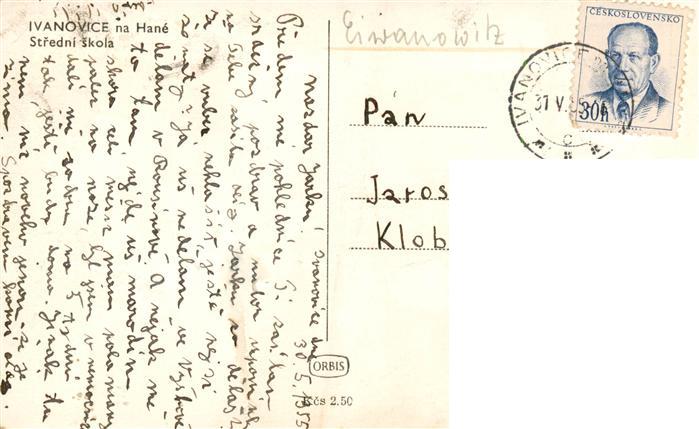 73958214 old postcard Ivanovice na Hane Brno Bruenn CZ Stredni skola Schule postalisch gelaufen Erhaltung siehe scans [FriedD77] KatCode: 11520