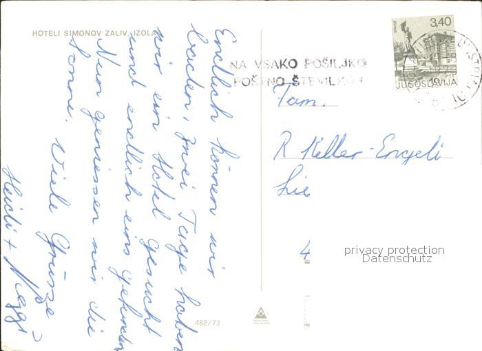 old postcard Izola Hotel Simonov Zaliv postalisch gelaufen Erhaltung siehe scans