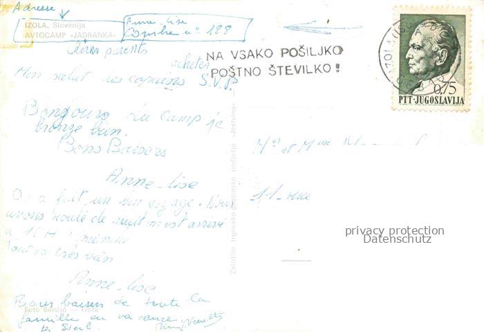 74043256 old postcard Izola Slovenia Aviocamp Jadranka postalisch gelaufen Erhaltung siehe scans [WerneD78] KatCode: 11500