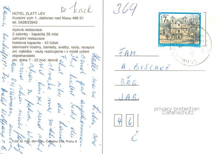 old postcard Jablonec nad Nisou Hotel Zlaty Lev postalisch gelaufen Erhaltung siehe scans [KathaD81]