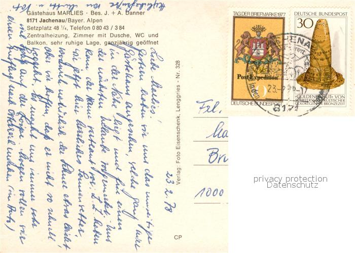 73646478 alte Postkarte Jachenau Gaestehaus Marlies in den Bayerischen Alpen postalisch gelaufen Erhaltung siehe scans [FriedD77] KatCode: 11110009173131