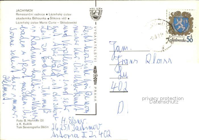 old postcard Jachymov Radnice Akademika Behounka Slikova vez Lazensky ustav Marie Curie Sklodowske postalisch gelaufen Erhaltung siehe scans