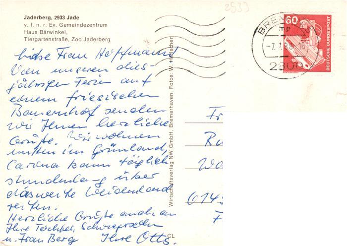 73934558 alte Postkarte Jaderberg Jade Gemeindezentrum Haus Baerwinkel Tiergartenstrasse Zoo Jaderberg postalisch gelaufen Erhaltung siehe scans [WerneD78] KatCode: 11110003461005
