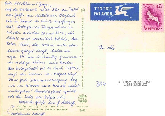 74010844 old postcard Jaffa Tel-Aviv Israel A lovely corner of Jaffas seaside postalisch gelaufen Erhaltung siehe scans [WerneD78] KatCode: 13080