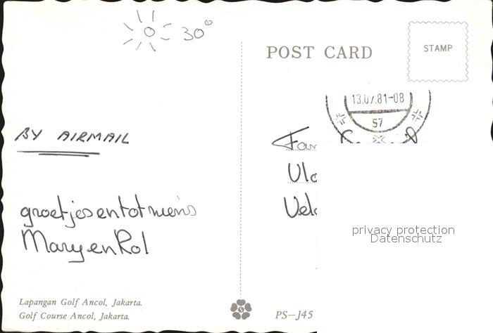 alte Postkarte Jakarta Fliegeraufnahme Golf Course Ancol postalisch gelaufen Erhaltung siehe scans