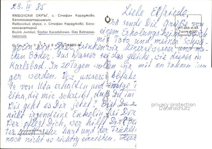 Jambol Stefan Karadshowa Balneosanatorium postalisch nicht gelaufen Erhaltung siehe scans