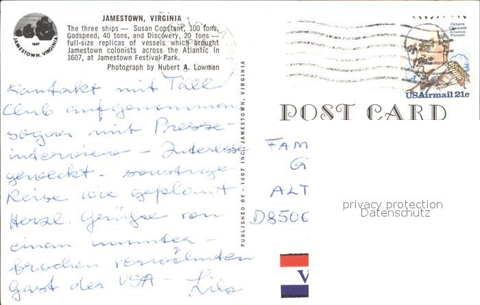72505675 old postcard Jamestown Virginia Ships Susan Constant postalisch gelaufen Erhaltung siehe scans KatCode: 14140490000000