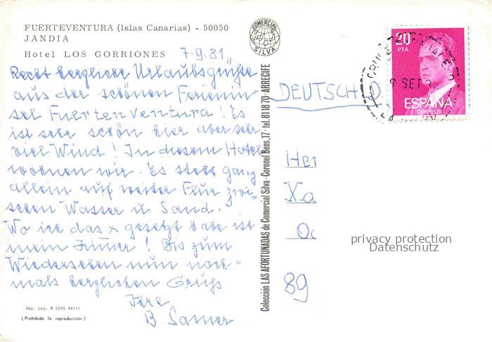 74116494 old postcard Jandia Fuerteventura Canarias ES Hotel Los Gorriones postalisch gelaufen Erhaltung siehe scans [WerneD78] KatCode: 11510