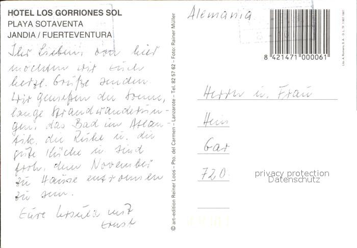 old postcard Jandia Hotel Los Gorriones Sol Playa Sotaventa vista aerea postalisch gelaufen Erhaltung siehe scans