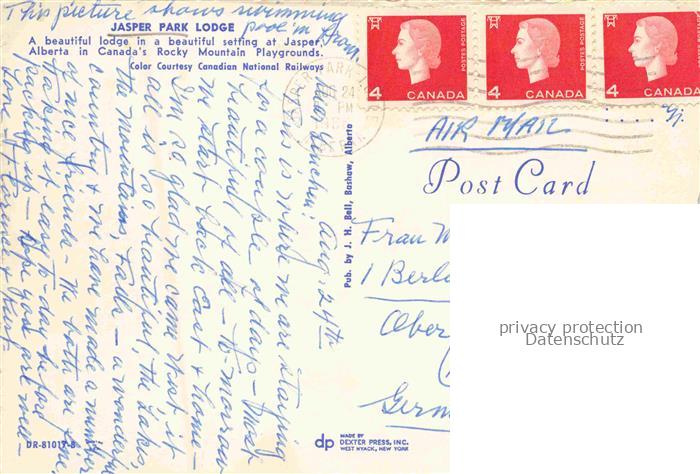74142387 old postcard Jasper Alberta Jasper Park Lodge Canada’s Rocky Mountains postalisch gelaufen Erhaltung siehe scans [FriedD77] KatCode: 14110