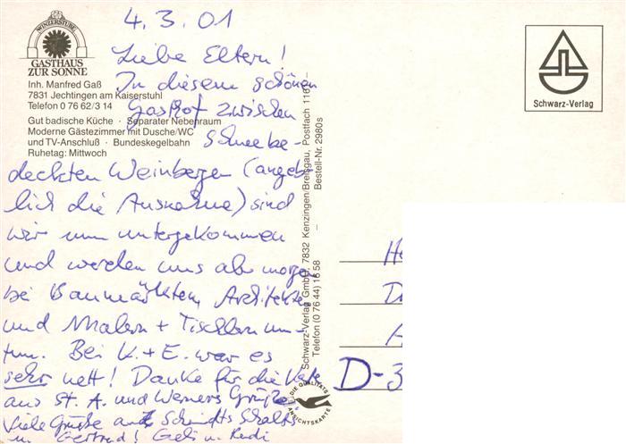 73880481 Jechtingen Gasthaus zur Sonne Winzerstube postalisch nicht gelaufen Erhaltung siehe scans [WerneD78] KatCode: 11110008316038