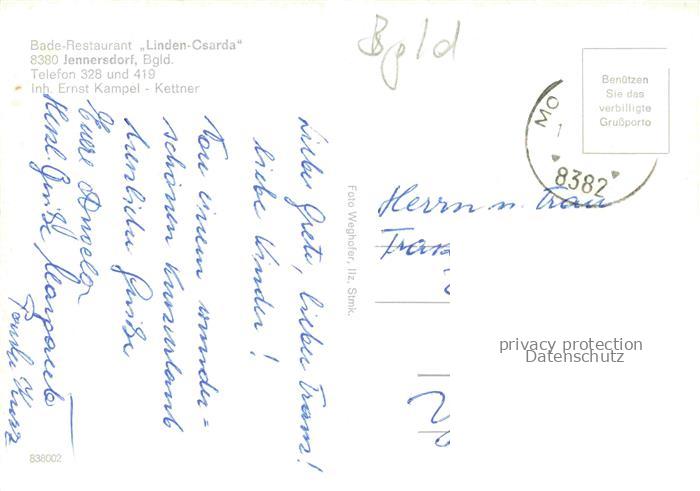 74156397 alte Postkarte Jennersdorf Burgenland AT Linden-Csarda Baderestaurant Terrasse Csarda-Eingang Reetdach Innenraum Maisdekor Restaurant postalisch gelaufen Erhaltung siehe scans [Karloger] KatCode: 11390113010504
