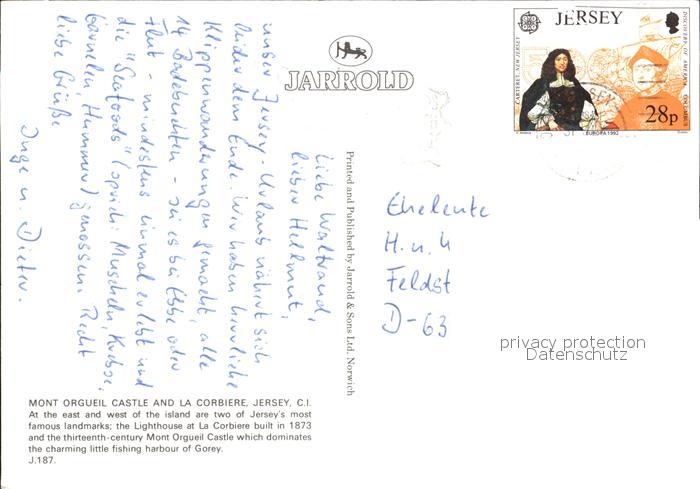 old postcard Jersey Kanalinsel Mont Orgueil Castle and La Corbiere Lighthouse postalisch gelaufen Erhaltung siehe scans